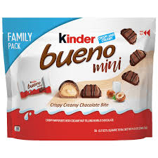 The Bueno Wafer Mini Bar in a 108g bag features crispy wafer layers filled with a smooth, creamy hazelnut filling, offering a delightful balance of texture and flavor. Its convenient packaging makes it perfect for sharing or enjoying on the go.