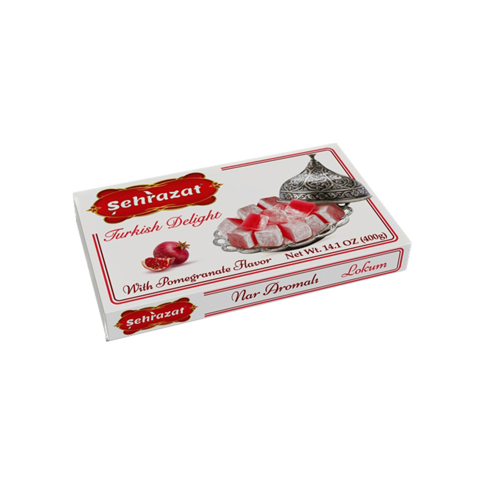 Sehrazat Turkish Delight with Pomegranate 400g is a traditional Turkish confection featuring soft, chewy cubes infused with pomegranate flavor and dusted with powdered sugar, offering a sweet and tangy treat.