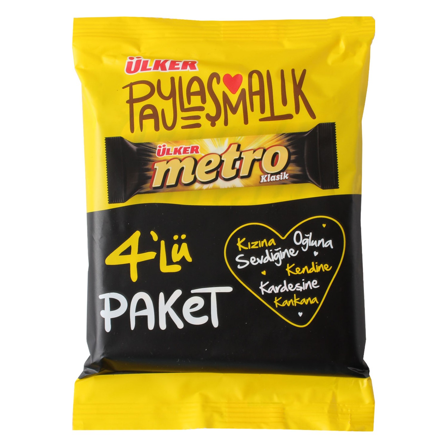 Ülker Metro is a popular Turkish candy bar featuring a combination of rich milk chocolate, soft nougat, and chewy caramel. The "4 PAKET 144G" refers to a multipack containing four individual 36g bars, for a total weight of 144 grams.